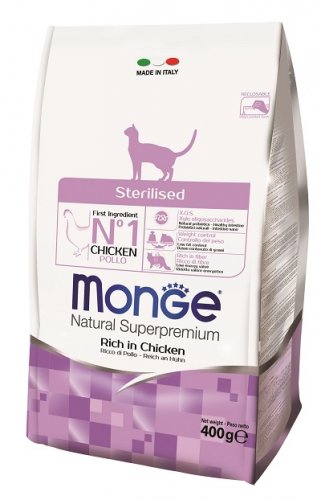 Sterilised Ricco di Pollo Formato: 400 g - 1,5 kg I croccantini Monge Natural Superpremium Sterilised sono un alimento completo per gatti adulti sterilizzati. Garantiscono il benessere del gatto grazie alla presenza di elementi nutritivi di altissima qualità, frutto della ricerca Made in Italy. Il primo ingrediente è il pollo e sono arricchiti con xilo oligossacaridi (X.O.S.), prebiotici naturali che favoriscono la salute dell’intestino. Ricchi di fibre e con un basso contenuto di grassi hanno un ridotto valore energetico. Pollo (fresco 10%, disidratato 26%), frumento, glutine di granturco, avena, proteine animali idrolizzate, grasso animale (olio di pollo contenuto in grassi 99,6%, conservato con antiossidanti naturali), fibra insolubile di pisello, farina di uovo intero (ricco in proteine nobili), pesce (salmone disidratato), olio di pesce (olio di salmone), taurina, X.O.S. (Xylo – oligosaccaridi 3 g/kg), idrolizzato di lievito (M.O.S.), yucca schidigera.