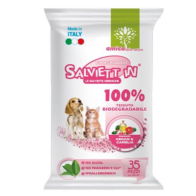 SALVIETTIN ARGAN E CAMELIA PZ.35 Salviett’in sono salviette umidificate in pacchetti da 35 pezzi, formato 30x20cm. 100% tessuto biodegradabile. No alcol, no parabeni, ipoallergenico.