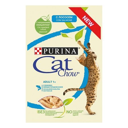 Cat Chow adult Salmone e Fagiolini 85 gr. Alimento completo per gatti adulti. Per il tuo Gatto straordinario, PURINA® Cat Chow® propone un alimento umido in gelatina per gatti con proteine di qualità e ingredienti naturali selezionati. La gamma CAT CHOW® in busta con pollo, manzo, agnello o salmone fornisce un‘alimentazione completa e bilanciata in aggiunta contiene ingredienti quali fagiolini, melanzane o zucchine per una combinazione perfetta che il tuo gatto naturalmente amerà. Composizione: Carni e derivati, estratti di proteine vegetali, pesci e sottoprodotti dei pesci*, (di cui salmone* 4%) sostanze minerali, ortaggi (0,8% melanzane disidratate equivalenti al 7% di melanzane), zuccheri, lieviti* *ingredienti naturali Additivi nutrizionali: Vitamina A (580 UI/kg) | Vitamina D3 (89 UI/kg ) | Vitamina E (13 UI/kg) | Taurina (360 mg/kg) | Solfato ferroso monoidrato (20 mg/kg) | Iodato di calcio anidro (0,26 mg/kg) | Solfato rameico pentaidrato (2,3 mg/kg) | Solfato manganoso monoidrato (4,0 mg/kg) | Solfato di zinco monoidrato (33 mg/kg) Additivi tecnologici: gomma cassia Dosi consigliate: Per un gatto adulto di circa 4 kg, somministrare da 3 a 4 buste al giorno in almeno 2 pasti separati. Si consiglia di adeguare la razione giornaliera alle specifiche esigenze del proprio gatto per mantenerlo in forma. Servire a temperatura ambiente. Lasciare sempre a disposizione una ciotola di acqua fresca e pulita.