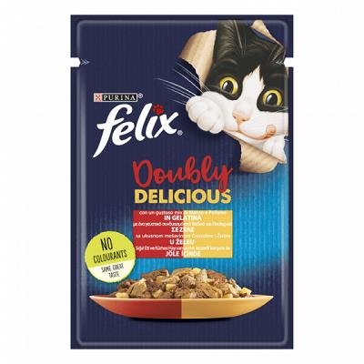 FELIX DOUBLY DELICIOUS G 85 MANZO E POLLAME FELIX® Doubly Delicious è una gamma di ricette irresistibili, dallaspetto, dal profumo e dal gusto così deliziosi, che ti sembrerà di averle cucinate con le tue mani! Ogni ricetta, preparata con ingredienti di qualità, è una combinazione di due deliziosi gusti, in teneri bocconcini in gelatina. Il tuo gatto potrà assaporare le sue due ricette preferite in un unico, ghiottissimo pasto. Sono anche una fonte di acidi grassi Omega 6 e contengono la giusta combinazione di vitamine che aiuta il tuo gatto a rimanere pieno di energia e sempre pronto a nuove marachelle! Sono una sana bontà e soddisfano al 100% il fabbisogno giornaliero del tuo gatto, se somministrate secondo le modalità duso e la razione giornaliera indicate sulla confezione. E non è tutto! FELIX® Doubly Delicious è disponibile in unampia varietà di deliziose ricette in gustosa gelatina per soddisfare ogni giorno la voglia di varietà del tuo gatto. Doppia bontà garantita! FELIX - semplicemente irresistibile! Composizione: Carni e derivati* (14%, di cui manzo 2% e pollame 2%), Estratti di proteine vegetali, Pesci e sottoprodotti dei pesci, Sostanze minerali, Zuccheri. *bocconcini: 44% Carne e derivati. Componenti analitici Umidità: 82.0% Proteina: 11.5% Oli e grassi grezzi: 2.5% Ceneri grezze: 2.5% Fibra grezza: 0.05% Acidi grassi Omega 6: 0.4% Additivi nutrizionali vitamina A ( 655 UI/kg) vitamina D₃ ( 100 UI/kg ) vitamina E ( 15 UI/kg) Solfato di ferro (II) monoidrato: (Fe: 7,6) mg/kg Iodato di calcio anidro: (I: 0,19) mg/kg Solfato di rame (II) pentaidrato: (Cu: 0,66) mg/kg Solfato manganoso monoidrato: (Mn: 1,5) mg/kg Solfato di zinco monoidrato: (Zn: 13) mg/kg Taurina: 413 mg/kg Aromatizzanti Conservanti Senza coloranti, lirresistibile gusto di sempre Modalità duso e razione giornaliera: per un gatto adulto di 4kg, versare il contenuto in una ciotola e servire una busta al giorno in abbinamento ad altri alimenti completi Purina. Per il benessere del tuo gatto, rispetta le linee guida di alimentazione. Servire a temperatura ambiente. Lasciare sempre a disposizione acqua fresca e pulita. Questo prodotto è un alimento complementare con un elevato contenuto di umidità, che permetterà al tuo gatto, mentre si nutre, di assumere parte della razione di acqua giornaliera raccomandata. Lasciare sempre a disposizione acqua fresca e pulita Conservazione Conservare il prodotto chiuso in luogo fresco e asciutto. Questa confezione non è un giocattolo. Per evitare rischi di soffocamento tenere lontano dalla portata di bambini e animali domestici.