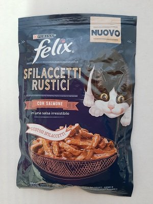 FELIX SFILACCETTI RUSTICI 80 G SALMONE Alimento completo per gatti adulti. Composizione: carni e derivati (16%), estratti di proteine vegetali, pesci e sottoprodotti dei pesci (salmone 4%), sostanze minerali, zuccheri, oli e grassi, sottoprodotti di origine vegetale. Sfilaccetti: 50% carni e derivati.