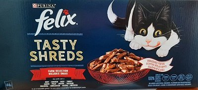 FELIX TASTY SHREDS PZ 44 X 80 GR Ogni pasto sarà una deliziosa sorpresa con Felix Sfilaccetti Rustici! Questo alimento umido per gatti adulti è composto da gustose varianti, per portare un po di varietà nella ciotola di Micio. Felix Sfilaccetti Rustici è un alimento completo e bilanciato, che fornisce al vostro gatto le preziose sostanze nutritive di cui ha bisogno, come gli acidi grassi Omega 6 e le vitamine D ed E. Questo alimento umido è costituito da teneri straccetti immersi in una deliziosa salsa. E confezionato in pratiche buste monoporzione per offrire al vostro amico felino un piacere fresco a ogni pasto. Felix Sfilaccetti Rustici non contiene conservanti, coloranti e aromi artificiali. Tutte le caratteristiche di Felix Sfilaccetti Rustici: alimento umido per gatti adulti bilanciato e completo al 100%: con componenti pregiati e selezionati con acidi grassi Omega 6 e vitamine D ed E: contribuiscono a maggiore vitalità e benessere ricetta appetitosa: teneri straccetti di carne o pesce in una gustosa salsa in diverse varianti: nei gusti manzo, pollo, anatra e tacchino pratiche buste monoporzione: per un piacere sempre fresco, a ogni pasto senza coloranti, conservanti e aromi artificiali Proteine gregge 13.5 % Grassi greggi 2.6 % Fibre grezze 0.05 % Ceneri gregge 2.6 % Umidità 78.0 % Acidi grassi Omega 6 0.5 %