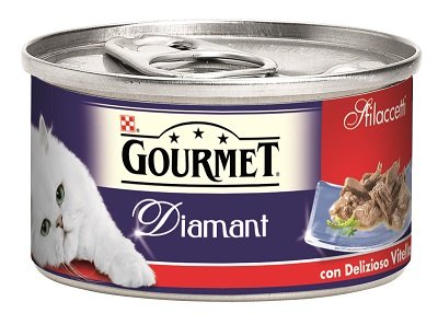 Composizione: Carni e derivati (di cui vitello 4%), estratti di proteine vegetali, pesci e sottoprodotti dei pesci, sostanze minerali, zuccheri. Additivi: Additivi nutrizionali: UI/kg: Vit. A: 1890 Vit. D3: 295 mg/kg: Fe(E1):13 I(E2):0,3 Cu(E4):1,1 Mn(E5):2,5 Zn(E6):13. Componenti analitici: Umidità 77,5% Proteina 14,0% Oli e grassi grezzi 3,5% Ceneri grezze 2,5% Fibra grezza 0,5%