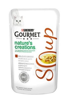GOURMET SOUP G40 POLLO, PESCE E VERDURE Alimento complementare per gatti adulti Esperienza sensoriale unica, grazie alla consistenza deliziosa Sfilaccetti al naturale Guarnito con verdure Senza coloranti, conservanti e aromi artificiali aggiunti. GOURMET Natures Creations Soup offre una gamma di gustose ricette per un’esperienza sensoriale unica che il tuo gatto adorerà. Riconoscerai a prima vista i raffinati ingredienti naturali, come pezzetti di pollo o pesce. GOURMET Natures Creations Soup con pollo, guarnito con pesce bianco e verdure è una deliziosa esperienza culinaria, il tuo gatto farà fusa di piacere. Le ricette sono senza coloranti, conservanti e aromi artificiali aggiunti. "Composizione: carni e derivati (pollo naturale 25%, preparazione a base di surimi (4,6%), ortaggi (0,50% da ortaggi disidratati), pesci e sottoprodotti dei pesci, sottoprodotti di origine vegetale. Componenti analitici: Umidità: 88.0% Proteina: 8.0% Oli e grassi grezzi: 0.10% Ceneri grezze: 1.5% Fibra grezza: 0.05%"