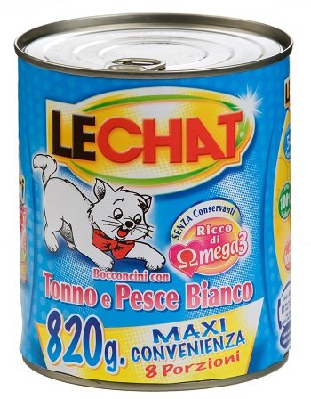 Bocconcini con Tonno e Pesce Bianco Formato: 400 g - 820 g Morbidi e gustosi bocconcini con tonno e pesce bianco cotti al forno utilizzando solo materie prime di ottima qualità, creati pensando ai nostri piccoli amici. LeChat Classico è una delle linee storiche di Monge continuamente rinnovata ma sempre con un richiamo al passato, il gattino cartoon che zampetta sulla lattina. Carni e derivati 20%, pesci e derivati 25% (di cui tonno 10%, pesce bianco 8%), cereali, uova, sali minerali.