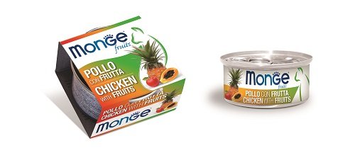 Monge Fruits Pollo con Frutta è un alimento complementare pensato per i gatti più raffinati ed esigenti che completa la gamma Monge Natural Superpremium, una linea completamente dedicata all’alimentazione naturale. La ricetta è a base di prelibato petto di pollo arricchito con frutta per garantire un equilibrato apporto di vitamine naturali e F.O.S. (frutto-oligosaccaridi). Tutte le materie prime e gli ingredienti utilizzati sono selezionati e soggetti a rigorosi controlli durante il processo di produzione, la frutta non è trattata chimicamente e non sono utilizzati né conservanti né coloranti. Grazie alla cottura al vapore è ancora più saporito, gustoso e appetibile. pollo 55%, frutta (ananas, mela, papaya) 6%, riso, F.O.S. (frutto-oligosaccaridi) 400 mg/Kg