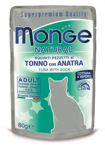 Alimento complementare per gatti adulti con deliziosi pezzetti di tonno con anatra, cotto al vapore, prodotto in Thailandia, con le tipiche caratteristiche del prodotto di alta qualità a base pesce: alta appetibilità grazie all’uso di ingredienti freschi e buon contenuto nutritivo. E’ ricco di Omega 3 e di proteine e ha un basso contenuto di grassi. Aiuta il gatto a mantenersi in buona forma e con un buon livello di energia. Tonno 45%, anatra 45%, riso, F.O.S. (frutto-oligosaccaridi) 400 mg/kg