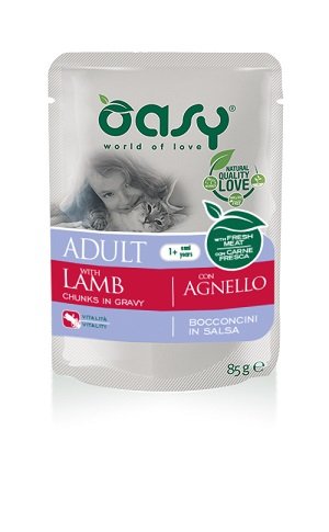 ALIMENTO COMPLETO CON AGNELLO PER GATTI ADULTI COMPOSIZIONE: Pollame, suino (10% suino fresco), agnello (4%), proteine animali disidratate, aminoacidi, fibra di piselli, sostanze minerali, amido di patata, destrosio. COMPONENTI ANALITICI: Proteina grezza 9%, Oli e grassi grezzi 5%, Fibra grezza 0,8%, Ceneri grezze 2,5%, Umidità 82%. ADDITIVI/KG: ADDITIVI NUTRIZIONALI: Vitamina D3 161 UI, Vitamina E 32 mg, Vitamina B1 2,47 mg, Ioduro di potassio 0,24 mg, Solfato manganoso, monoidrato 5,94 mg, Solfato rameico, pentaidrato 2,47 mg, Solfato di zinco, monoidrato 43,87 mg, Taurina 233 mg. ADDITIVI TECNOLOGICI: Gomma cassia 563 mg. SENZA CONSERVANTI E COLORANTI ARTIFICIALI. PRODOTTO SENZA GLUTINE. RAZIONE GIORNALIERA CONSIGLIATA: per gatti adulti da 3 a 5 kg, somministrare da 3 a 4,5 buste al giorno.