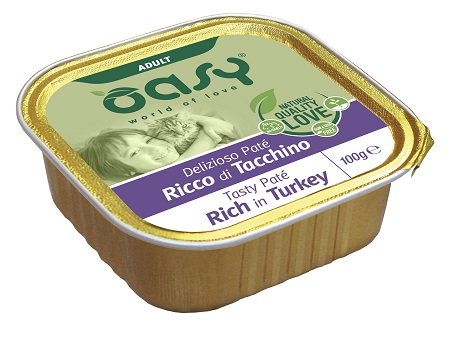DELIZIOSO PATÉ - RICCO DI TACCHINO ALIMENTO COMPLETO PER GATTI ADULTI. COMPOSIZIONE: Carni e derivati (≥64%, di cui Tacchino 14%), sostanze minerali. COMPONENTI ANALITICI: Proteina 10%, Oli e grassi grezzi 5%, Ceneri grezze 2%, Fibra grezza 0,4%, Umidità 82%. ADDITIVI/KG: Additivi nutrizionali: Vitamina D3 200 UI, Vitamina E 30mg, Solfato di zinco, monoidrato 32mg, Solfato manganoso, monoidrato 4,3mg, Iodato di calcio, anidro 0,15mg, Chelato rameico di amminoacidi, idrato 10mg Additivi tecnologici: Gomma cassia 1500 mg. Senza coloranti, conservanti e aromatizzanti artificiali. SUGGERIMENTI DUSO: da 2,5 a 3 vaschette al giorno per gatti adulti di 4 kg. La razione giornaliera può variare in base all’età e al livello di attività fisica dell’animale. Suddividere la razione in più pasti giornalieri. Conservare in luogo fresco e asciutto e somministrare a temperatura ambiente. Lasciare sempre a disposizione del gatto acqua fresca e pulita.