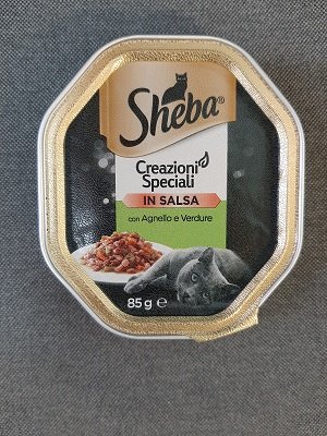 SHEBA G 85 CREAZIONI SPECIALI IN SALSA AGNELLO E VERDURE Alimento umido completo per gatti adulti. Composizione: carni e derivati (40% di cui 92% naturale, di cui 4% agnello), verdure (di cui 4% carote e fagiolini misti), cereali sostanze minerali, erbe aromatiche, zuccheri.