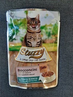 STUZZY CAT BOCCONCINI PESCE BIANCO JELLY GR 85 Cottura al vapore, senza coloranti né conservanti. Preparate in morbida gelatina contengono vitamine e minerali utili a coadiuvare il mantenimento di pelle sana e pelo lucido e a garantire una efficace assimilazione dei nutrimenti. Mangime completo per animali da compagnia Composizione Carni e derivati pesci e sottoprodotti dei pesci (pesce bianco 4%) sottoprodotti di origine vegetale (inulina 0,4%) sostanze minerali. Additivi Additivi nutrizionali/kg: vit. D3 200 U.I. vit. E 100 mg biotina 100 μg taurina 100 mg solfato di zinco monoidrato 13,5 mg solfato manganoso monoidrato 4,6 mg solfato rameico, pentaidrato 15,6 mg ioduro di potassio 0,6 mg. (valori per kg. di prodotto) Componenti analitici Proteina 7,5% fibra grezza 0,3% tenore in materia grassa 4% ceneri grezze 2% umidità 82%