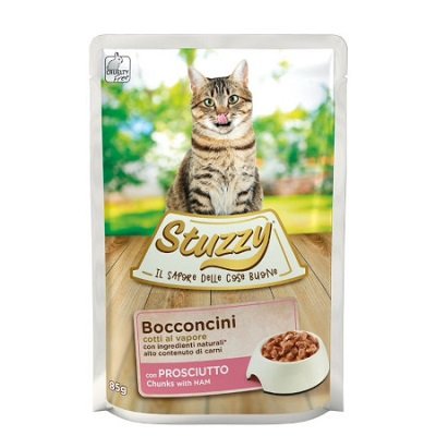 STUZZY CAT BOCCONCINI PROSCIUTTO GR 85 Il gusto semplice del prosciutto e tutta la genuinità di ingredienti naturali cotti al vapore: i Bocconcini con Prosciutto di Stuzzy sono la ricetta completa che conquisterà il tuo gatto. Da leccarsi i baffi! Mangime completo per animali da compagnia Composizione 45% carni e derivati (8% prosciutto), sottoprodotti di origine vegetale (0,4% inulina da cicoria), sostanze minerali. Additivi Additivi nutrizionali: vit. D3 200 U.I., vit. E 100 U.I., biotina 100 μg, taurina 100 mg, Zn (solfato di zinco monoidrato) 20 mg, Mn (solfato manganoso monoidrato) 3 mg (valori per kg. di prodotto) Componenti analitici Proteina 7,5%, fibre grezze 0,3%, grassi grezzi 4%, ceneri grezze 1,5%, umidità 82%