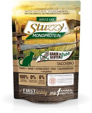 STUZZYCAT MONOPROTEICO G 85 TACCHINO Il cibo umido per gatto Stuzzy Monoprotein Grain e Gluten Free é un alimento bilanciato ideale per lalimentazione quotidiana del tuo amico tigrotto. Creato mediante lutilizzo di ununica proteina animale e privo di carboidrati e glutine. Tacchino:70% tacchino, 28,9% brodo di tacchino, 1% sostanze minerali, 0,1% olio di semi di lino
