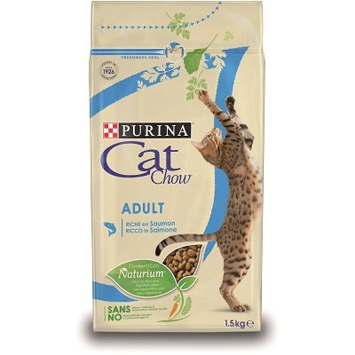 Alimento completo per gatti adulti. La nostra ricetta è ricca in salmone e fonti di proteine scelte espressamente per la loro qualità nel soddisfare le naturali esigenze dei gatti. "Composizione: Cereali (44% cereali integrali*), Carni e derivati (15%), Estratti di proteine vegetali, Pesci e sottoprodotti dei pesci (7%**), Oli e grassi, Sottoprodotti di origine vegetale (2,7% polpa di barbabietola disidratata, 0,07% prezzemolo disidratato equivalente a 0,4% di prezzemolo*), Ortaggi* (2% radice di cicoria disidratata, 0,07% di carota disidratata equivalente a 0,4% di carota, 0,07% spinaci disidratati equivalente a 0,4% di spinaci), Sostanze minerali, Lieviti* (0,3%). *Ingredienti naturali**equivalente al 14% di pesce e derivati reidratati, minimo 14% salmone. Additivi nutrizionali: UI/kg: Vit A: 11 500 Vit D3: 950 Vit E: 80 mg/kg: Solfato ferroso monoidrato: 130 Iodato di calcio anidro: 2.2 Solfato rameico pentaidrato: 32 Solfato manganoso monoidrato: 14 Solfato di zinco monoidrato: 160 Selenito di sodio: 0.2 Vitamine del gruppo B: 105 Con antiossidanti. Componenti analitici: Proteina 32,0% Oli e grassi grezzi 11,0% Ceneri grezze 7,5% Fibra grezza 2,5% "