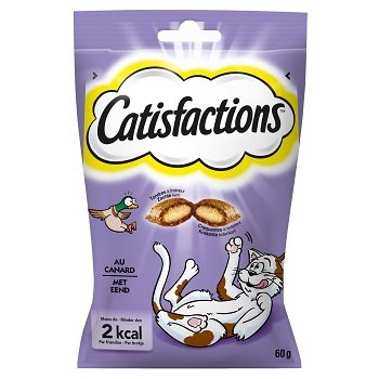 Catisfactions con Anatra: estratti di proteine vegetali, cereali, carne e sottoprodotti animali (min. 4% anatra), oli e grassi, sali minerali.