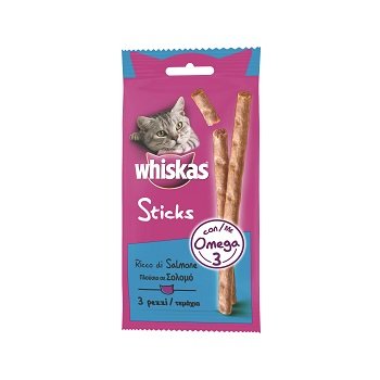Whiskas Sticks è una gamma pensata per i fuori pasto del tuo gatto, stuzzicante e con una particolare attenzione al suo benessere, disponibilE nelle tre varietà manzo, pollo e salmone. Whiskas Sticks sono golosi stick di carne nutrizionalmente bilanciati, ideali per viziare il tuo gatto tra un pasto e l’altro. Salmone:Pesci e sottoprodotti dei pesci (salmone min 50%), Carni e derivati, lieviti, zuccheri, sostanze minerali, cereali, oli e grassi, erba aromatica.