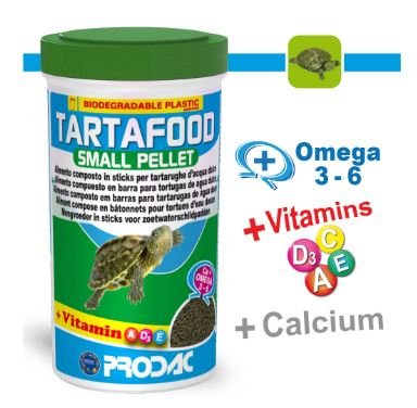 Alimento composto in pellet per tartarughe d’acqua dolce di piccola taglia. Composizione: cereali, pesci e sottoprodotti di pesci, vegetali e sottoprodotti, molluschi e crostacei, alghe, lieviti. Additivi nutrizionali: Vitamina A (3a672a) 24.900 U.I./kg, Vitamina D3 (3a671) 3.000 U.I./kg, Vitamina E (3a700) 290 mg/kg, Vitamina C (3a312) 237 mg/kg. Componenti Analitici: proteina grezza 38,60%, ceneri grezze 11,62%, fibre grezze 3,11%, grassi grezzi 5,49%, umidità 6,43%, Omega 6 21,14%, Omega 3 11,79%, calcio 3,11%.