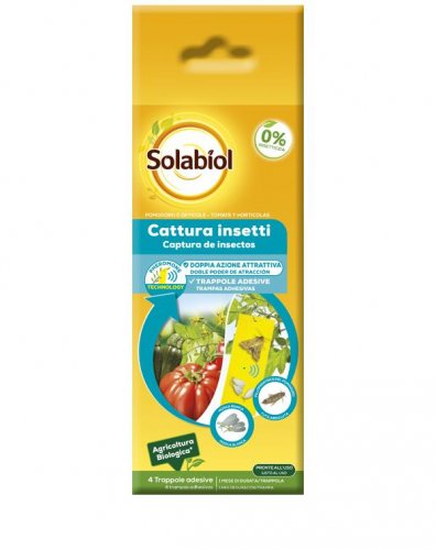 La trappola adesiva Cattura Insetti è linnovativa soluzione naturale per la cattura ed il monitoraggio della fillominatrice del pomodoro (Tuta absoluta) e della mosca bianca (Trialeurodes vaporiarum). La trappola, oltre a richiamare naturalmente gli insetti grazie al suo colore giallo, contiene anche i 2 feromoni di attrazione specifici per gli insetti bersaglio che vengono quindi attirati e catturati nel foglio adesivo. La trappola è resistente alla pioggia e agli altri agenti atmosferici, garantendo fino a un mese di efficacia. Doppia azione attrattiva 0% insetticidi pronto alluso autorizzato in agricoltura biologica Taglie disponibili: 4