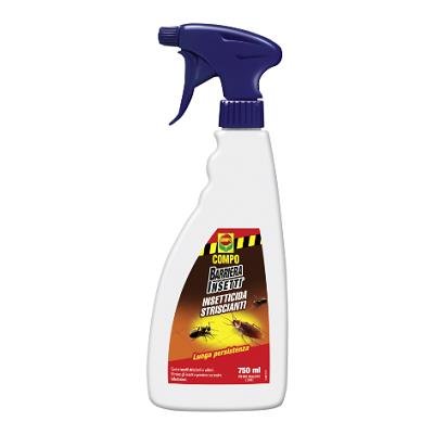 COMPO BARRIERA INSETTI ML 750 Insetticida liquido pronto alluso a largo spettro e lunga persistenza Utilizzabile sia in ambienti interni che esterni Efficace contro blatte, formiche, zecche, cimici, ragni e altri insetti striscianti Previene le successive infestazioni per 2-3 settimane Descrizione del prodotto COMPO Insetticida RTU Striscianti è un insetticida/acaricida liquido microincapsulato pronto alluso a largo spettro dazione e lunga persistenza. È efficace nel controllo di pulci, acari, tarme, blatte, formiche, cimici, zecche, ragni, lepisme ed altri insetti striscianti infestanti ambienti interni ed esterni di stabili e fabbricati in genere. E efficace anche contro insetti volanti come zanzare, compresa la zanzara "Tigre", mosche, tafani, vespe e moscerini. Elimina infatti gli insetti che si appoggiano sulle superfici trattate, per esempio muri, siepi, pavimenti, persiane, tende ecc. COMPO Insetticida RTU Striscianti elimina gli insetti presenti al momento del trattamento e previene linsorgere di successive infestazioni per 2-3 settimane. Impiego Raccomandazioni per luso Agitare bene il contenitore prima delluso. Non spruzzare il prodotto nellaria ma solo su superfici.